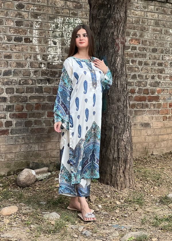 The NUREH Cord Set offers refined elegance with its soft ivory shade and delicate blue paisley patterns. Crafted from smooth Shamooz silk, this two-piece set includes a slim-fit, straight-cut top paired with comfortable palazzo bottoms. Designed for winter wear, it combines traditional digital-printed motifs with a modern silhouette, making it ideal for daily wear that stands out with subtle sophistication and timeless style.